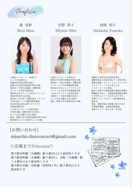 平尾多美納、 阿野由希子の各氏に、ピッコロを山腰まり氏に師事。現在、 相愛大学大学院音楽研究科1年次に関西初のピッコロ専攻生として在籍。